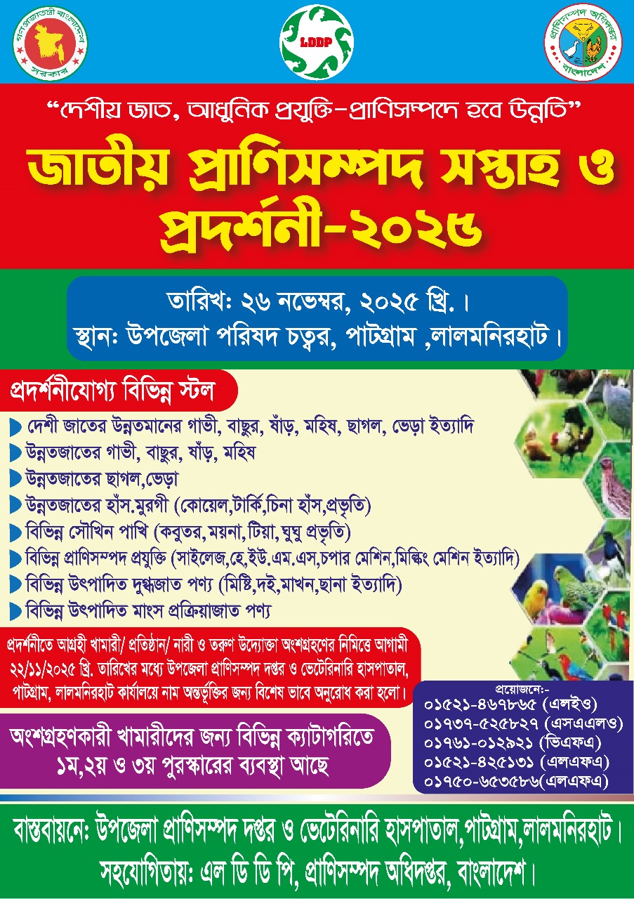 | ১ | "জাতীয় প্রাণিসম্পদ সপ্তাহ-২০২৫" উদযাপন এর অংশ হিসেবে সারাদেশের ন্যায় উপজেলা প্রাণিসম্পদ দপ্তর ও ভেটেরিনারি হাসপাতাল,পাটগ্রাম, লালমনিরহাট আগামী ২৬ নভেম্বর, ২০২৫ খ্রি. তারিখে আয়োজন করতে যাচ্ছে "প্রাণিসম্পদ প্রদর্শনী-২০২৫" | | ১৮-১১-২০২৫ | দেখুন | |